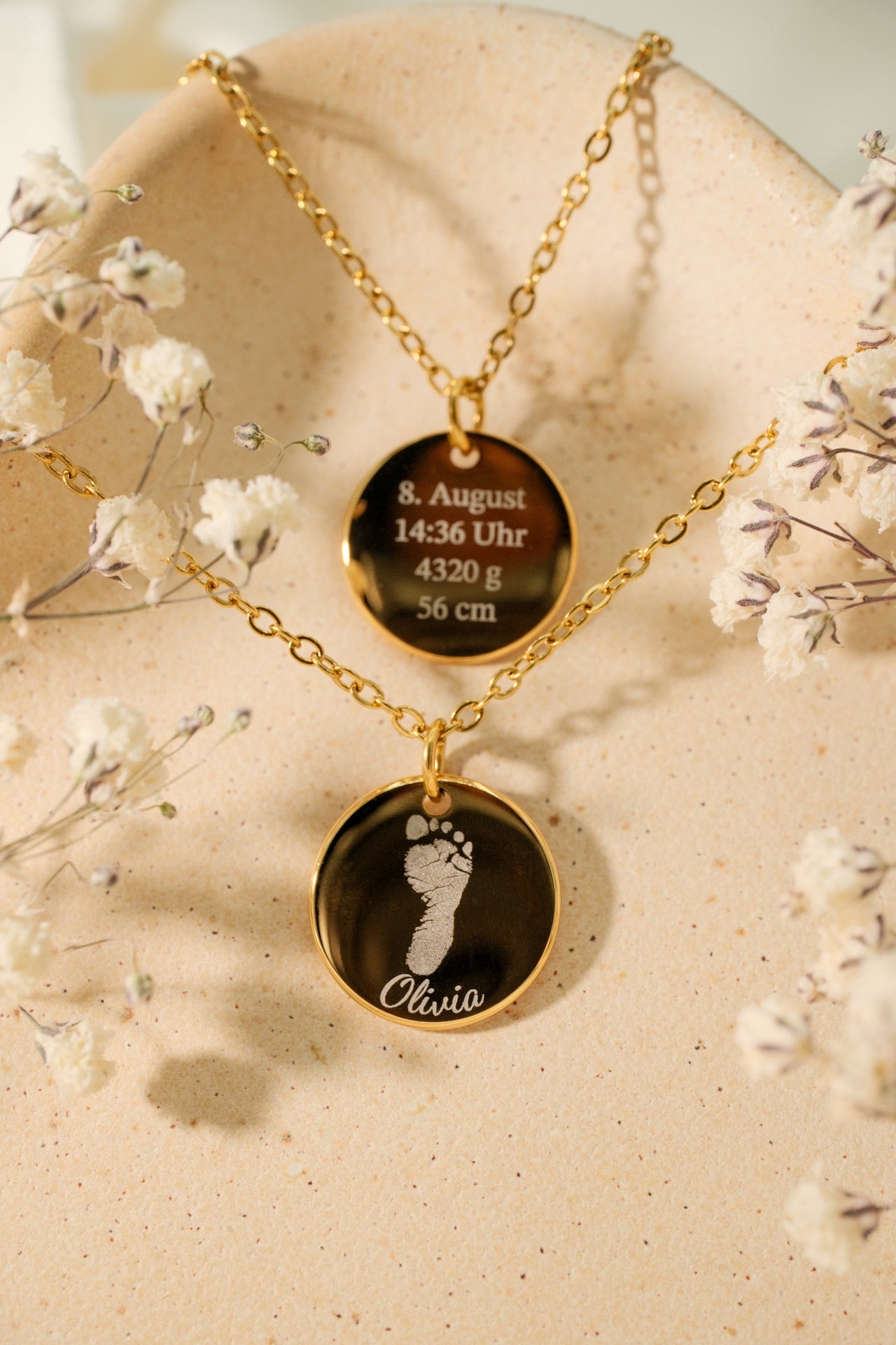 Auf der Rückseite kannst du zusätzlich die Geburtsdaten verewigen – für ein Schmuckstück, das mehr Bedeutung trägt als jedes andere.